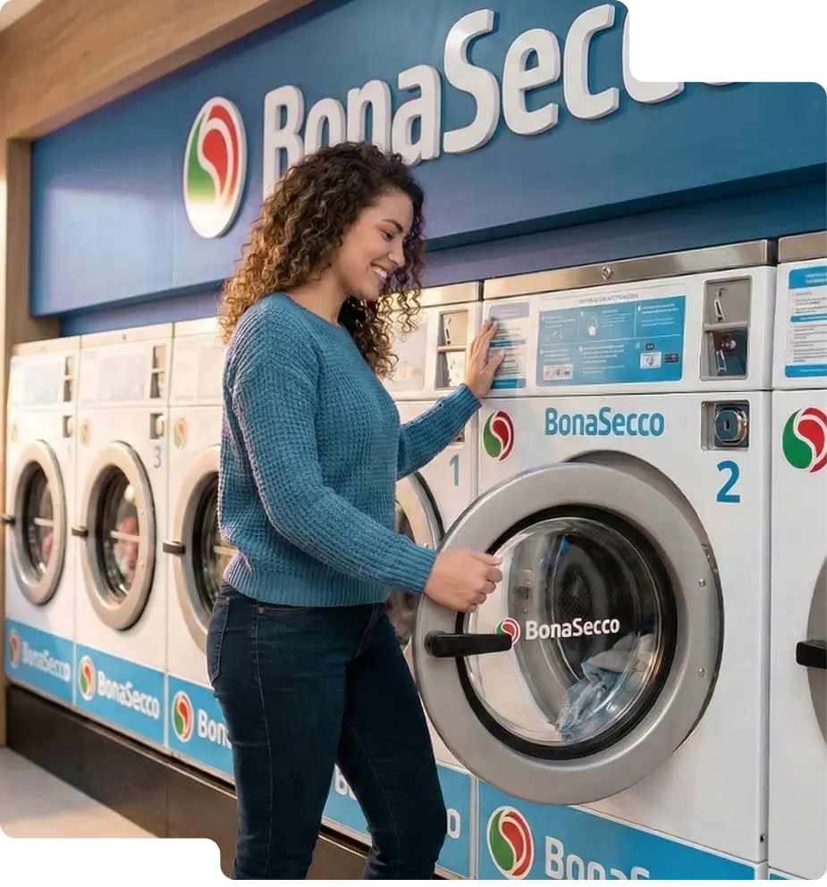 A Itália é o país que inventou a indústria moderna de lavanderias. A BonaSecco opera com equipamentos italianos de alto padrão — os mesmos usados nas melhores redes do mundo. Isso significa: menos manutenção, maior durabilidade, melhor resultado para o cliente. E cliente satisfeito volta. Toda semana.