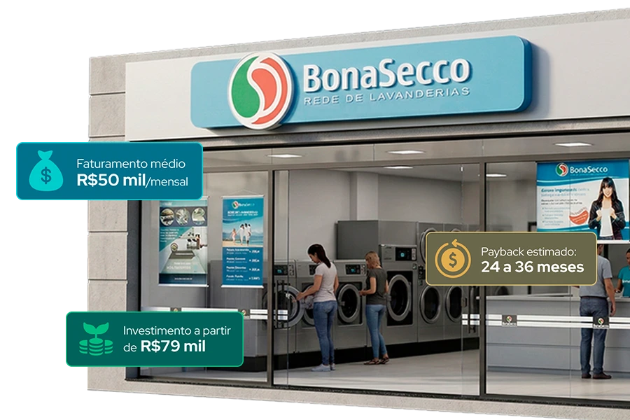 A BonaSecco é a franquia de lavanderia self service com tecnologia italiana, 20 anos de mercado e modelo 100% automatizado. Você fatura enquanto vive a sua vida.